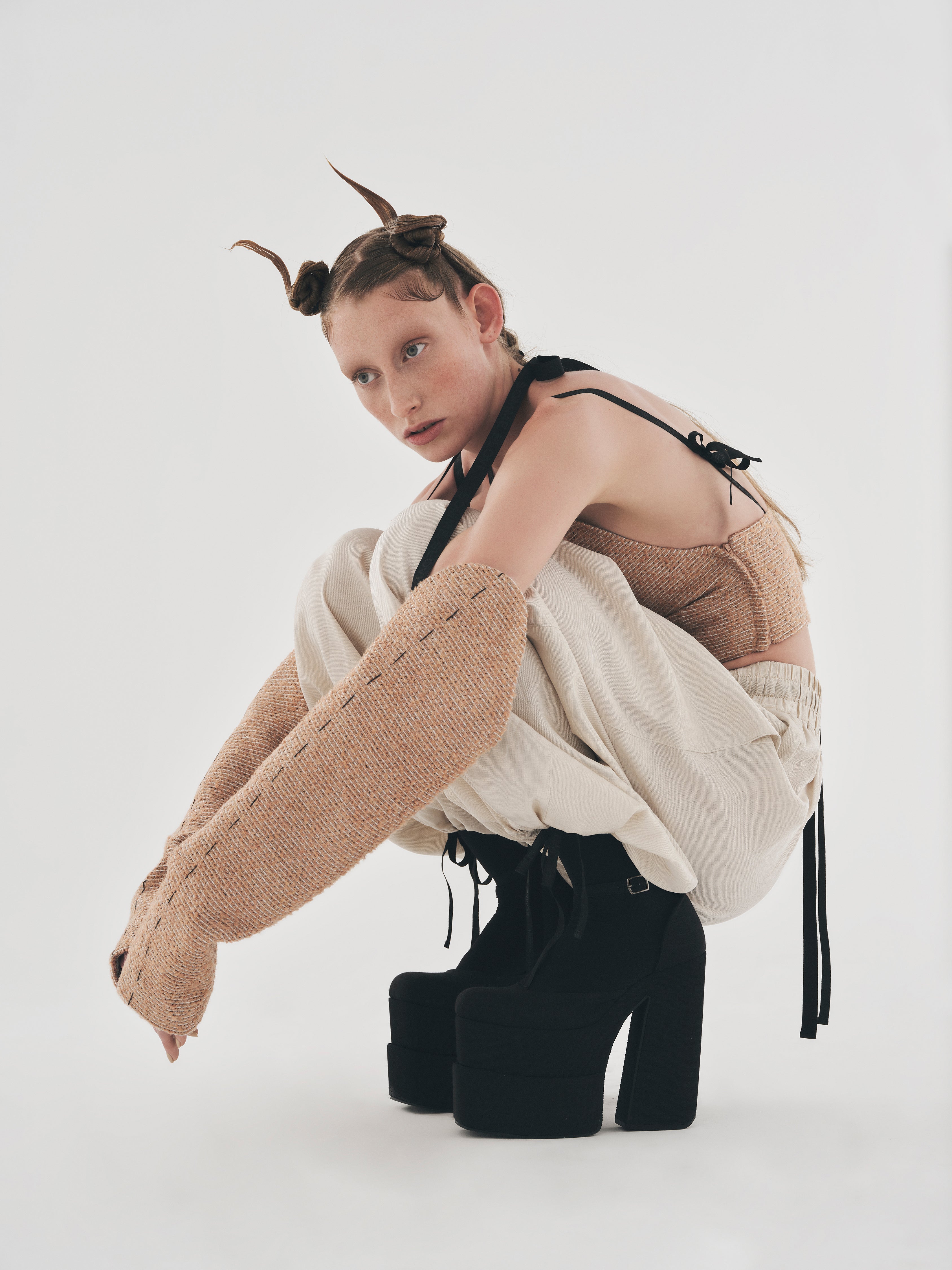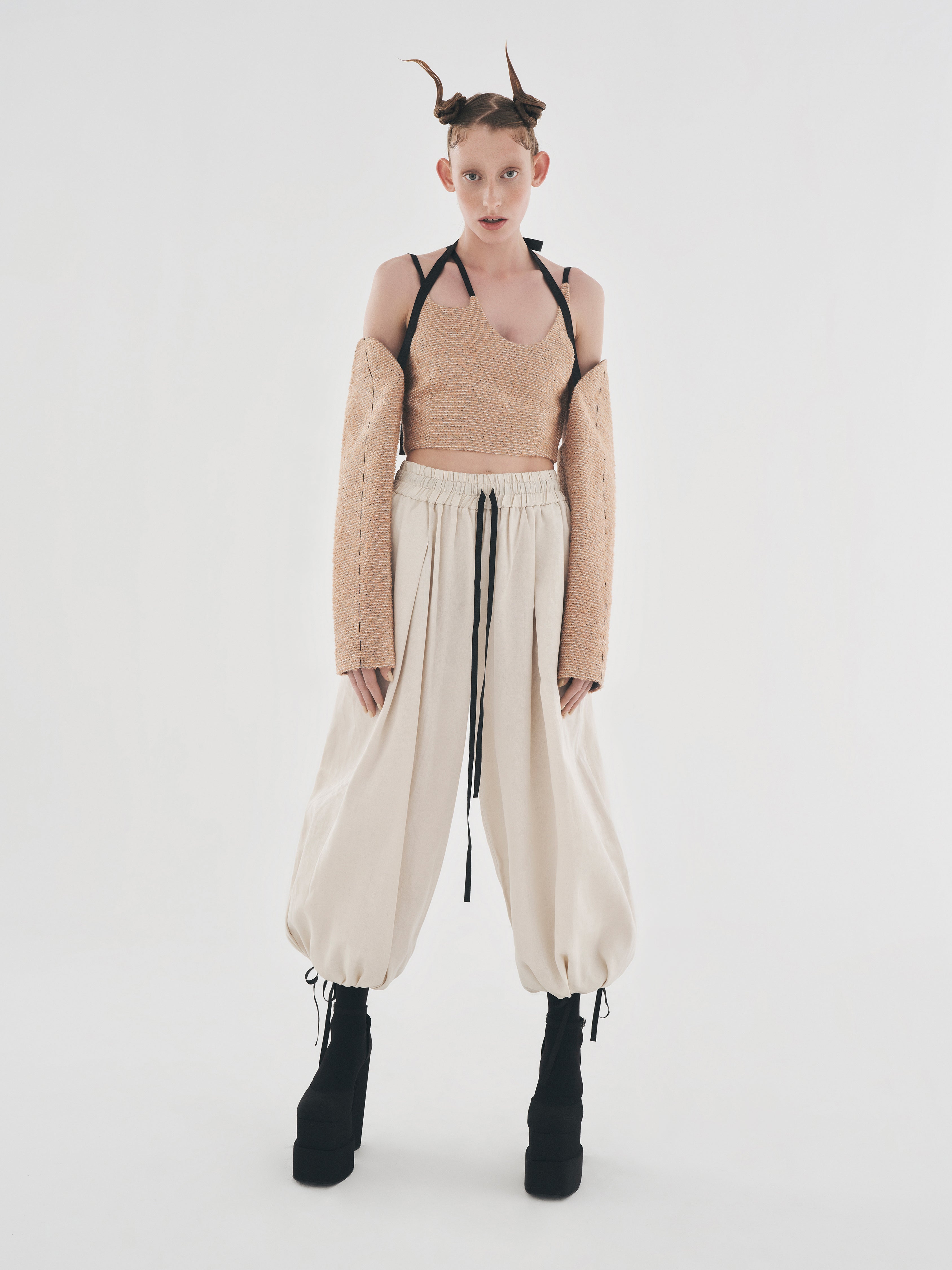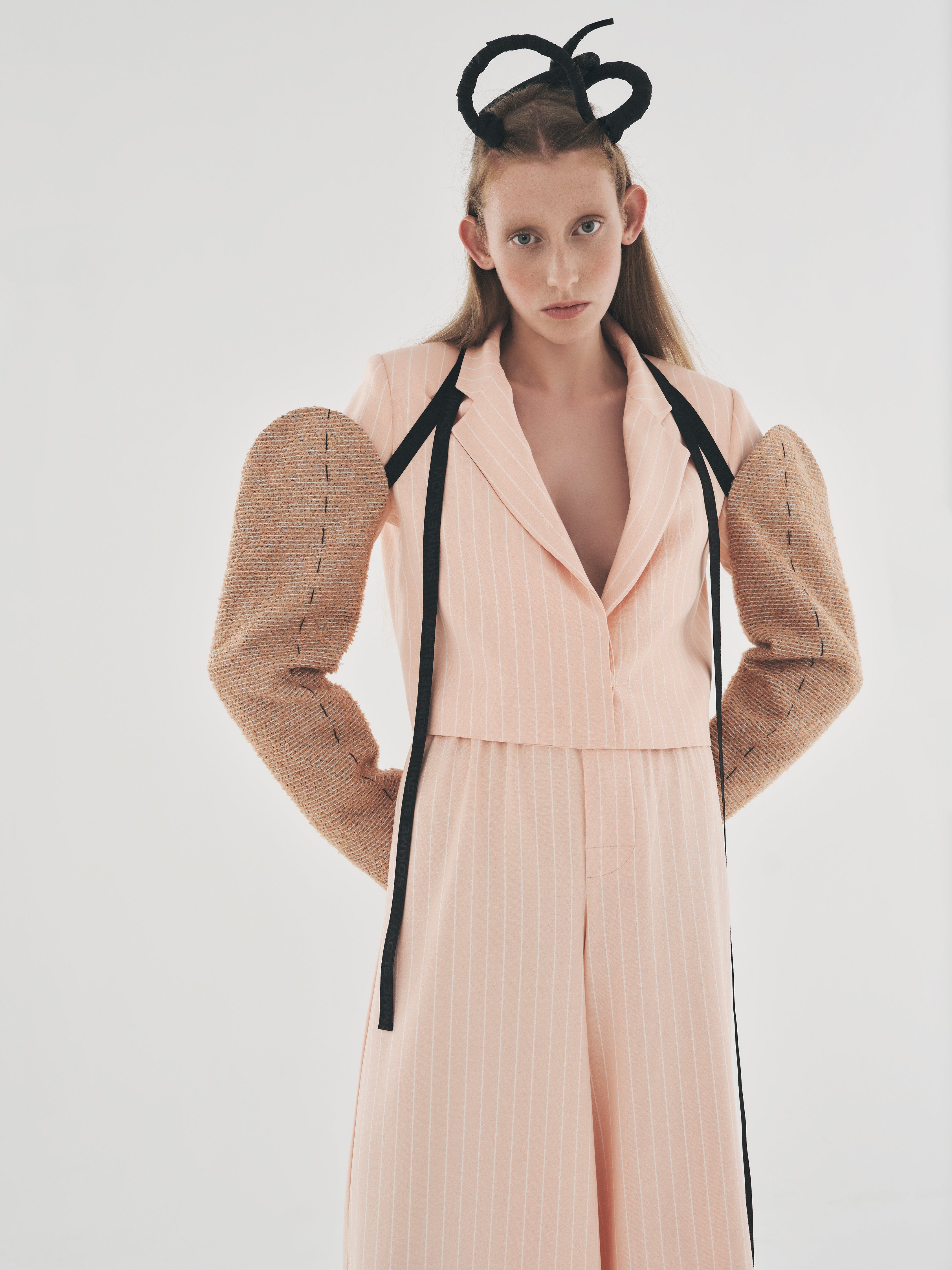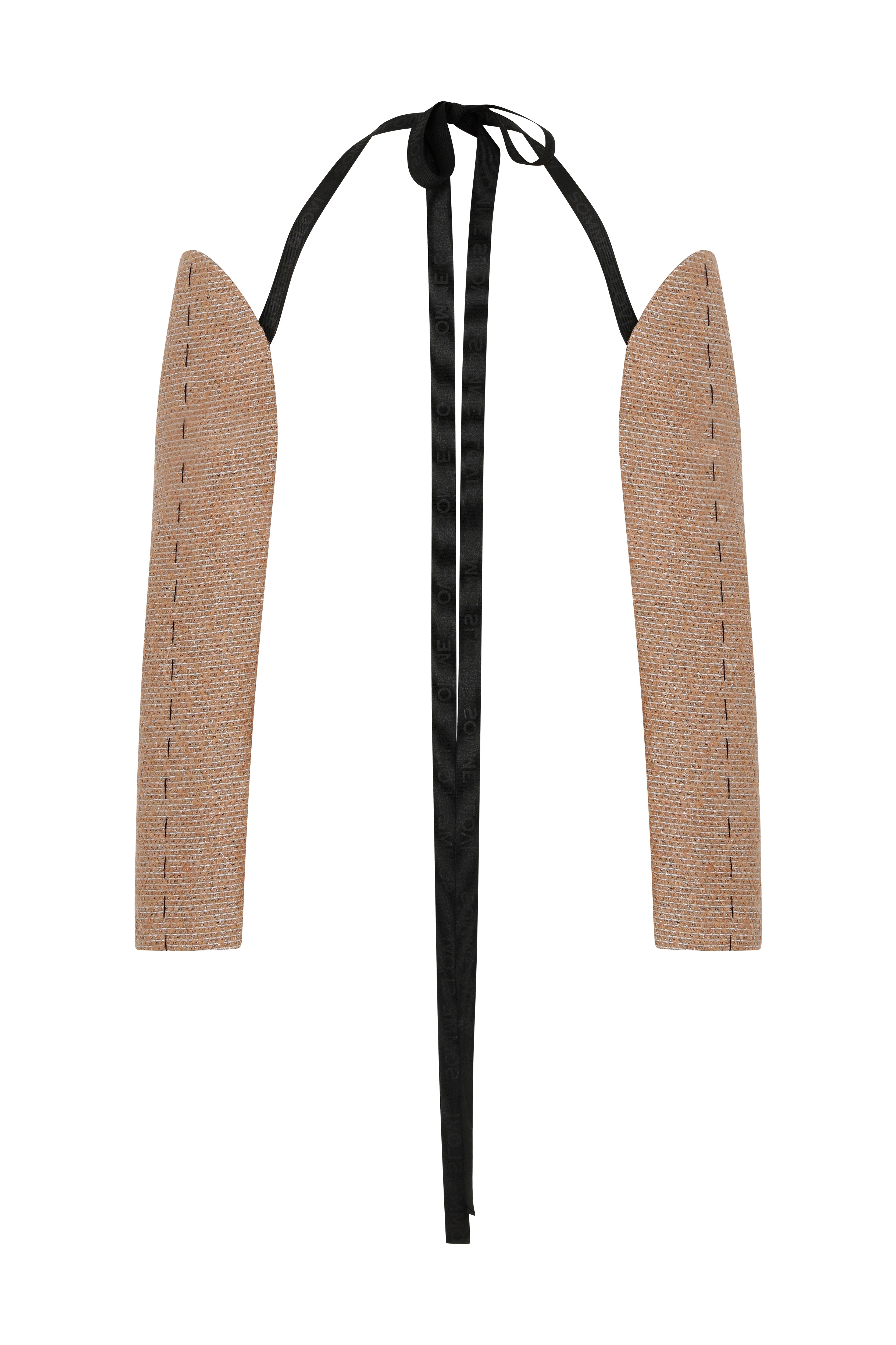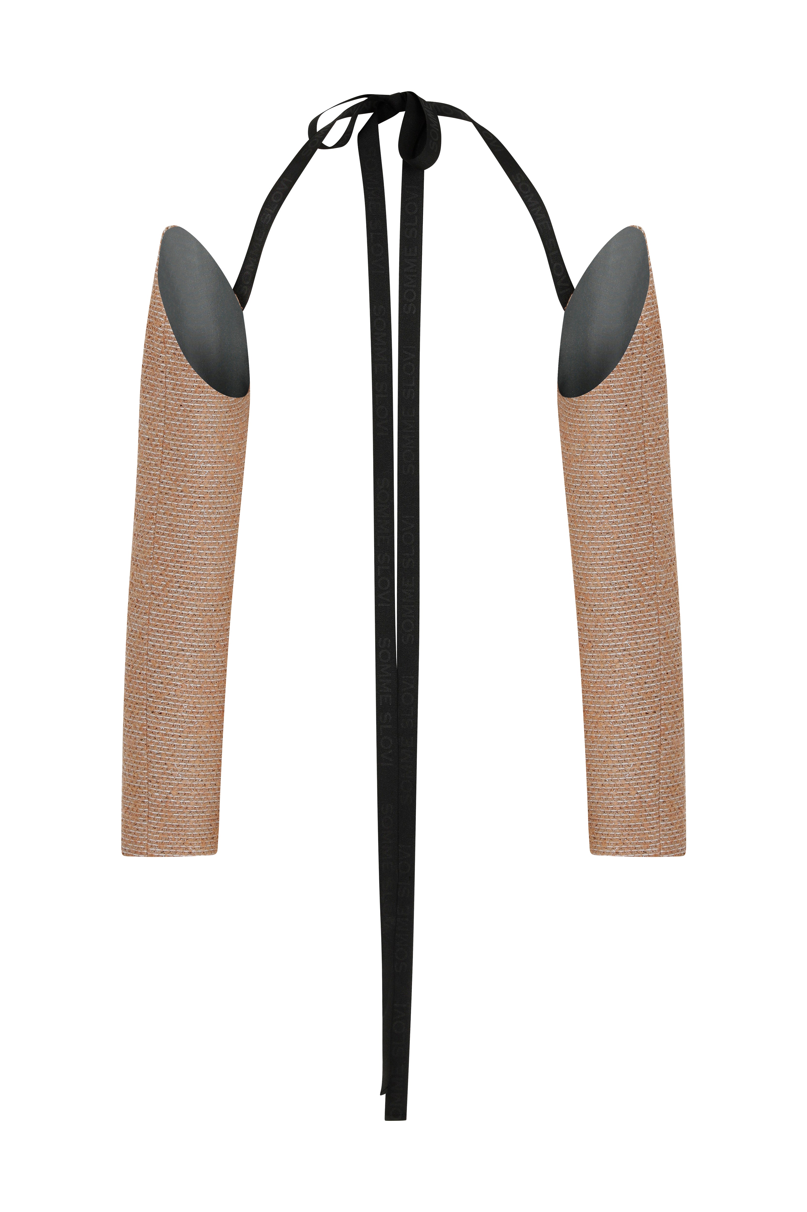 TWEED SLEEVES WITH ADJUSTABLE BLACK TIES. FEATURES WORK-IN-PROGRESS STITCH DETAILS ON SLEEVES. BLACK LOGO PRINTED ON THE LENGTH OF THE BLACK TIES. FULLY LINED.